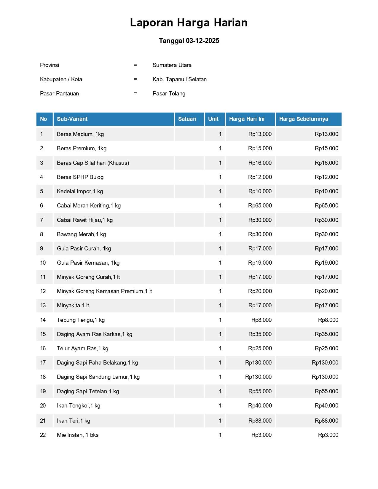 Laporan Harga Harian Bahan Pokok Kab. Tapanuli Selatan Pasar Tolang 3 Desember 2025