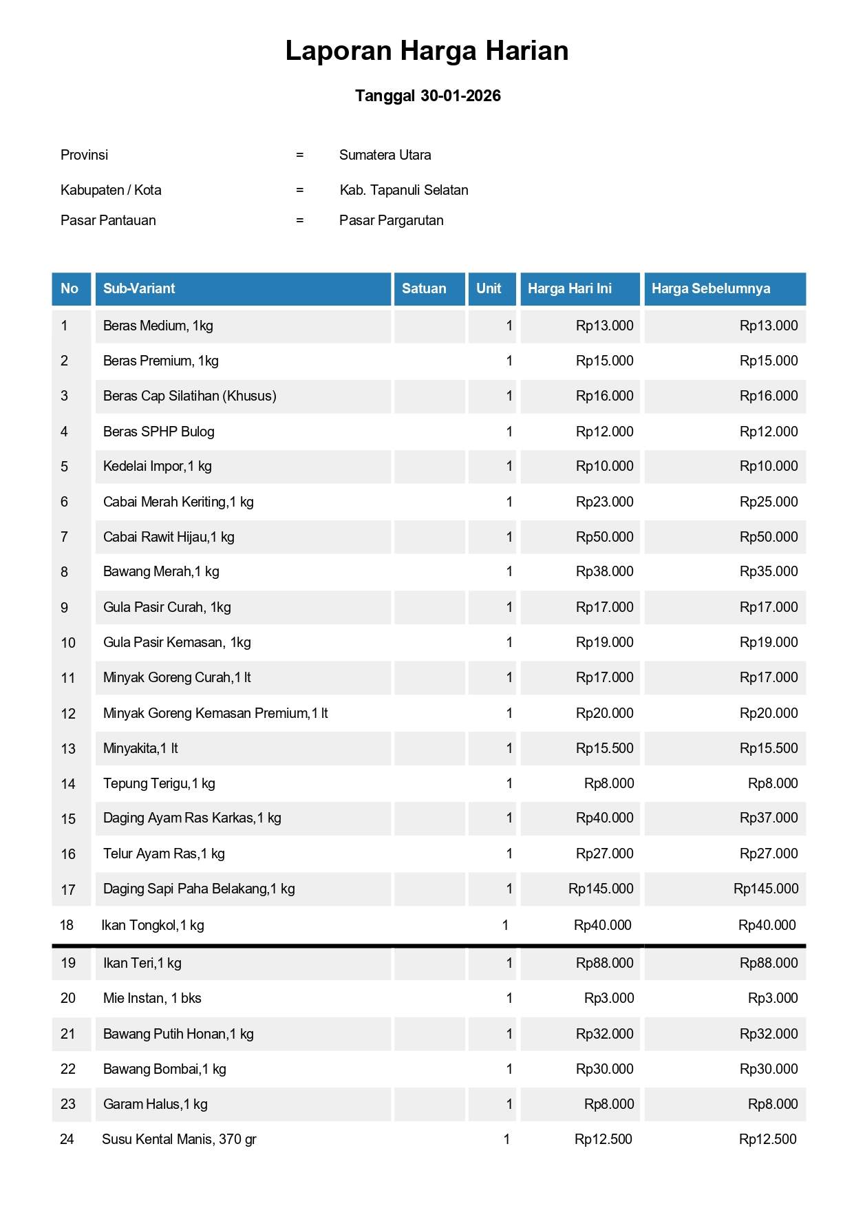 Laporan Harga Harian Bahan Pokok Kab. Tapanuli Selatan Pasar Pargarutan 30 Januari 2026