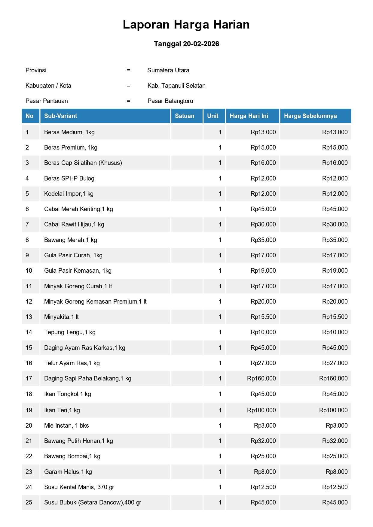 Laporan Harga Harian Bahan Pokok Kab. Tapanuli Selatan Pasar Batangtoru 20 Februari 2026