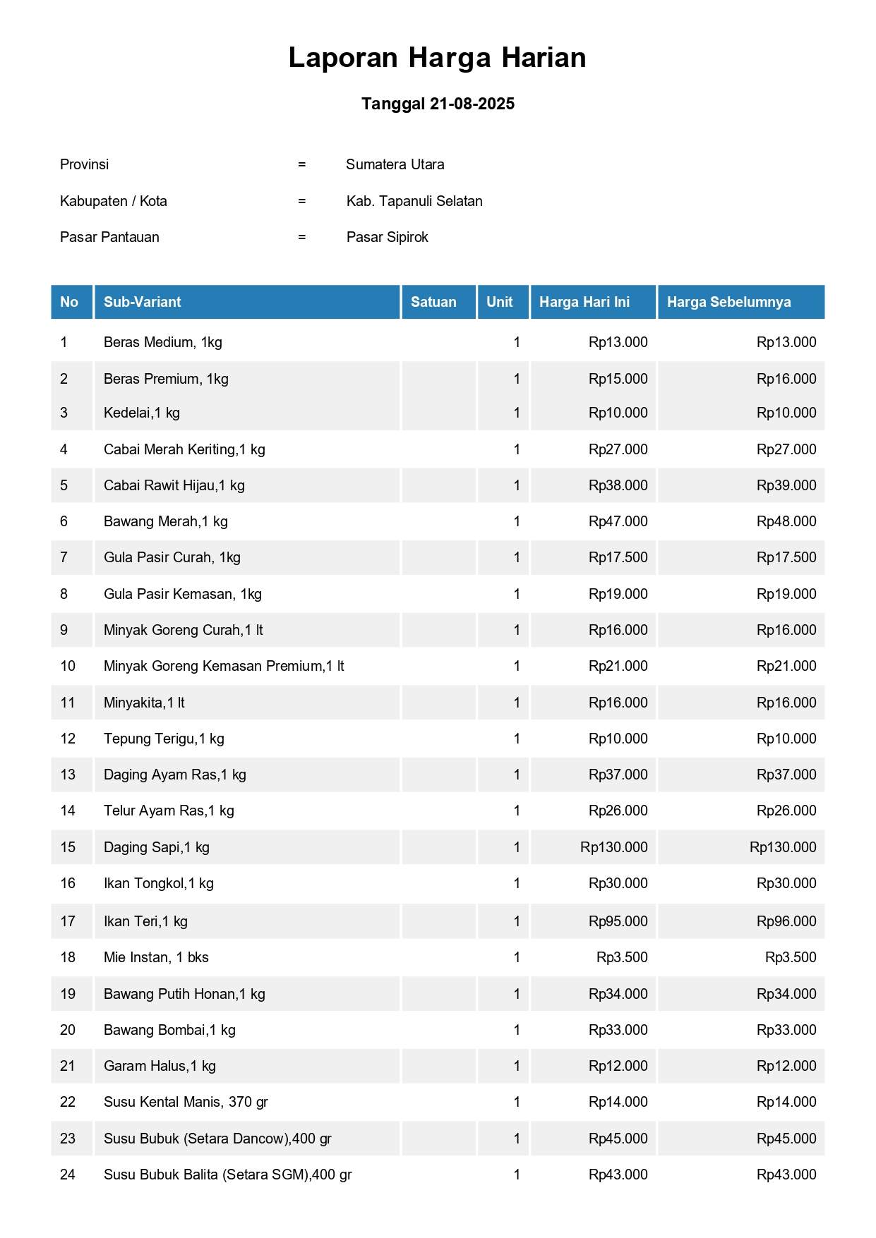 Laporan Harga Harian Bahan Pokok Kab. Tapanuli Selatan Pasar Sipirok 21 Agustus 2025