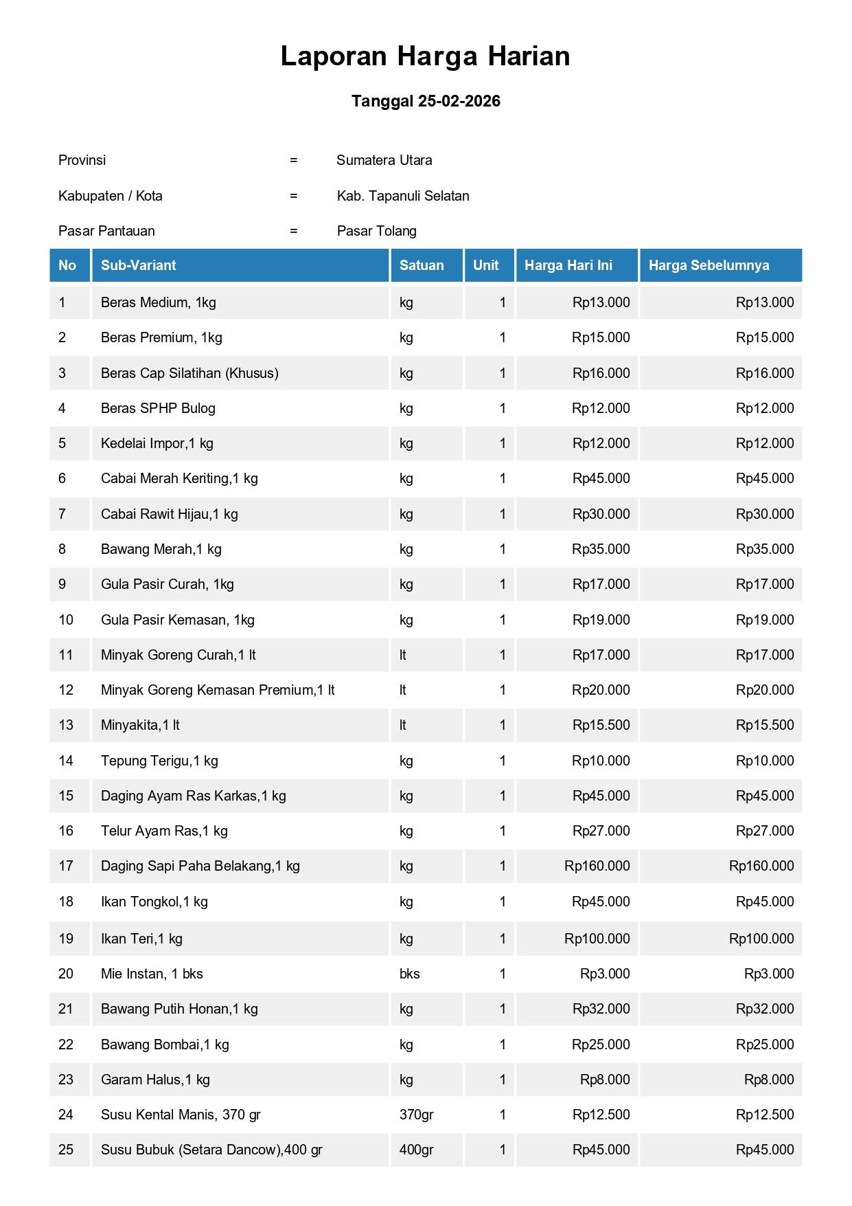 Laporan Harga Harian Bahan Pokok Kab. Tapanuli Selatan Pasar Tolang 25 Februari 2026