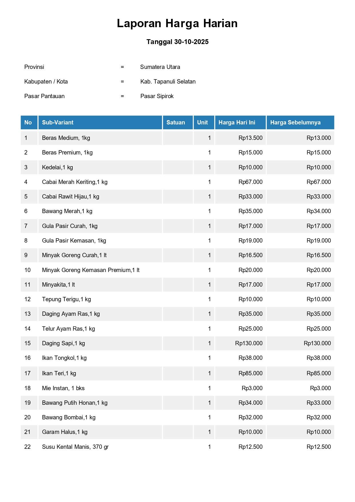 Laporan Harga Harian Bahan Pokok Kab. Tapanuli Selatan Pasar Sipirok 30 Oktober 2025