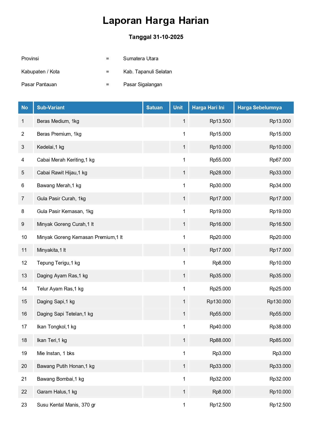 Laporan Harga Harian Bahan Pokok Kab. Tapanuli Selatan Pasar Sigalangan 31 Oktober 2025