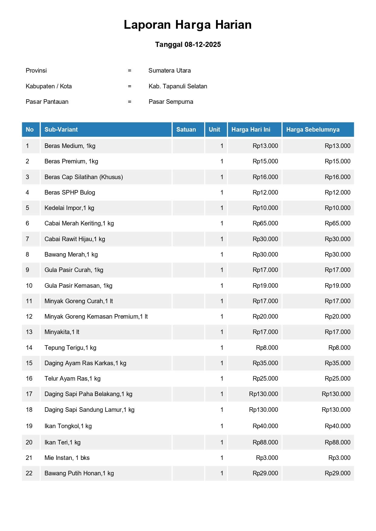 Laporan Harga Harian Bahan Pokok Kab. Tapanuli Selatan Pasar Sempurna 8 Desember 2025