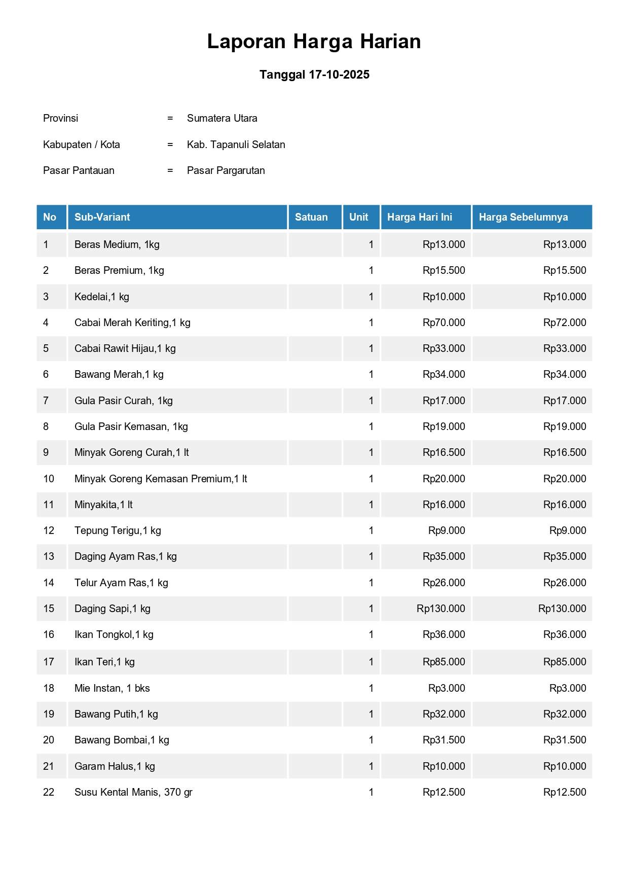 Laporan Harga Harian Bahan Pokok Kab. Tapanuli Selatan Pasar Pargarutan 17 Oktober 2025