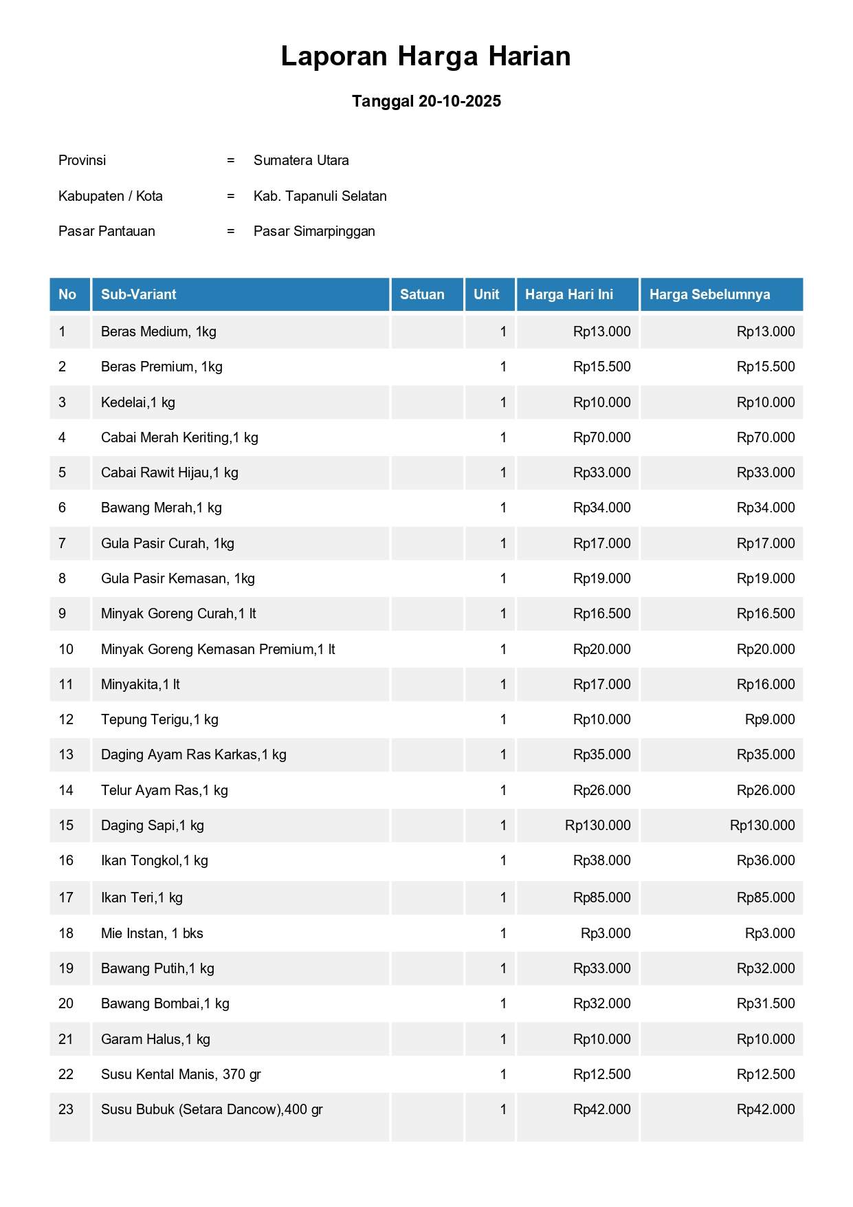 Laporan Harga Harian Bahan Pokok Kab. Tapanuli Selatan Pasar Simarpinggan 20 Oktober 2025