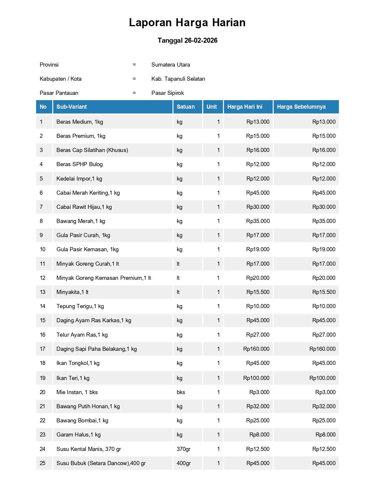 Laporan Harga Harian Bahan Pokok Kab. Tapanuli Selatan Pasar Sipirok 26 Februari 2026